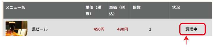 の各メニューの「状況」について、「調理完了」という文言を「調理中」に変更しました。